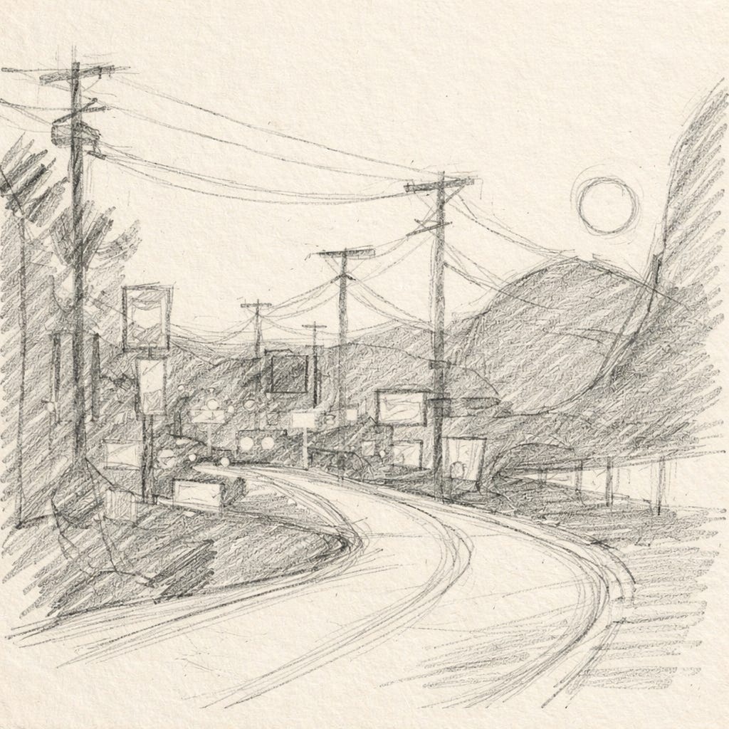 Then I’ll do a quick sketch. Just the road, big shapes, where things sit. Nothing polished.