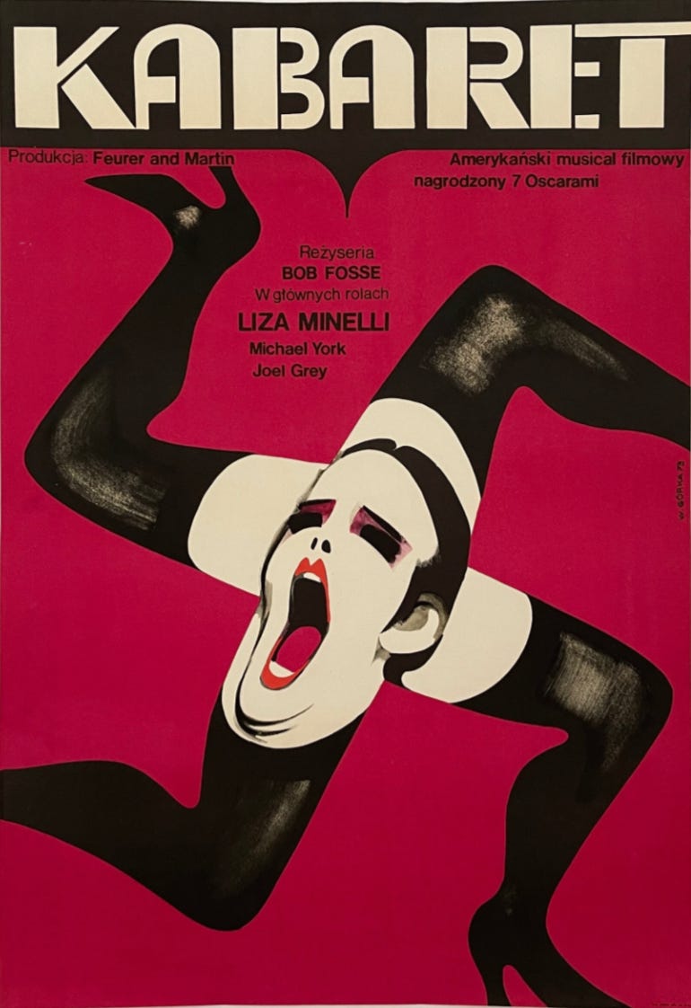 The 1950s through the 1970s marked the golden era of Polish movie posters. In 1973, designer Wiktor Górka created one of the most iconic Polish posters for the film Cabaret. His work is a masterclass in bold, provocative design, using a clever visual metaphor to capture the film’s decadence, sexuality, and underlying political tension.
