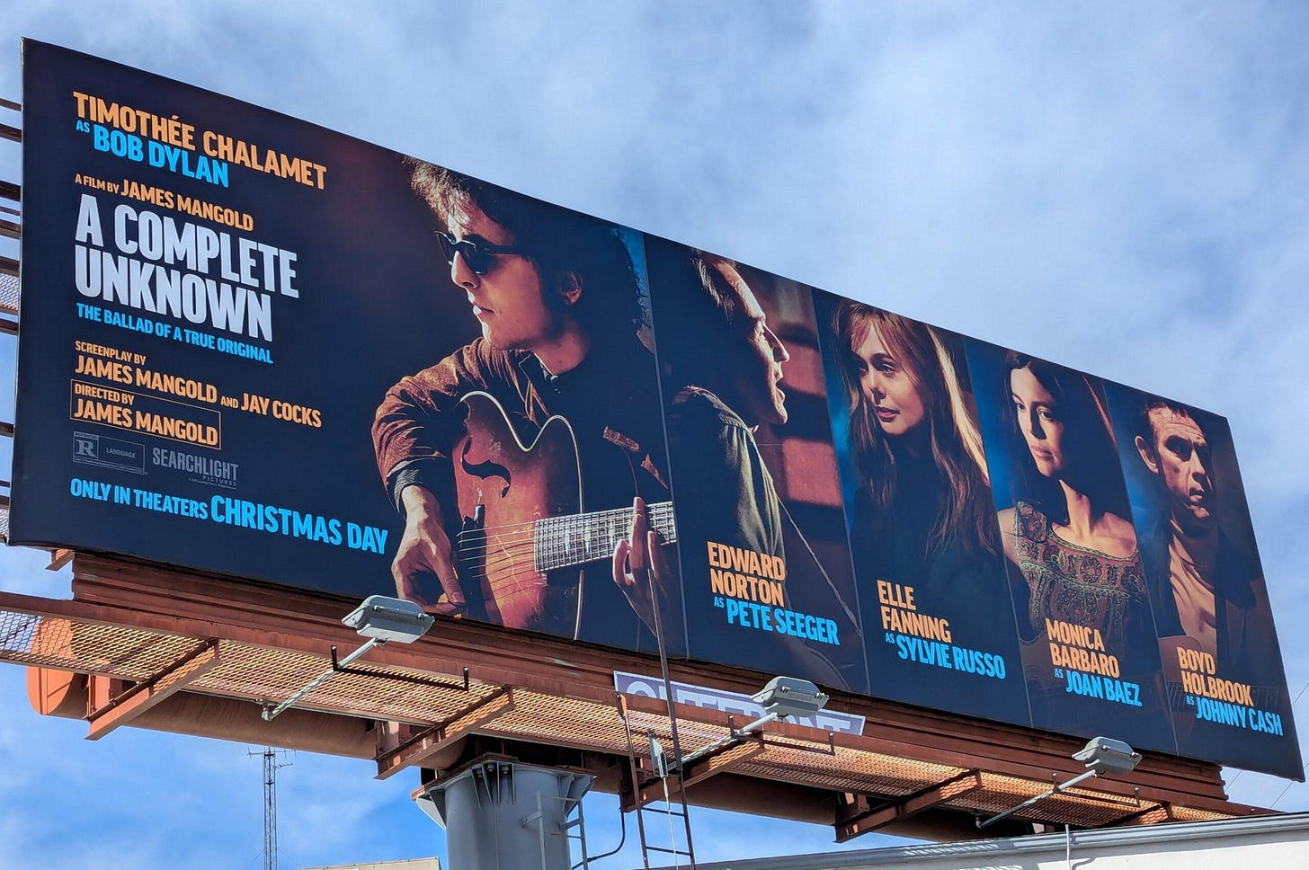 Driving down the Sunset Strip a few weeks ago—which, for non-Angelenos, is famous for its massive, colorful billboards that light up the area in a dazzling display of American glamour and pop culture—I spotted a giant poster for A Complete Unknown, the new Bob Dylan biopic starring Timothée Chalamet. The design? Just Chalamet’s face, with a few smaller photos of the supporting cast. No visual storytelling, no sense of Dylan’s impact, no hint of the film’s themes—just Chalamet’s face.